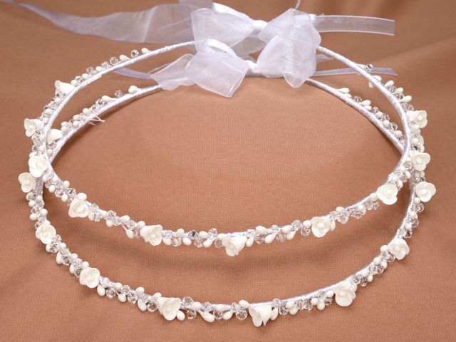 Greek Wedding Crowns, Stefana. Crystals, pearls, stephanotis, roses, flowers, olive branches, white or ivory, silver or gold. We can coordinate your candles to match. Make sure to choose a beautiful tray and some boubous for your guests, modern or traditional. Everything you need for your traditional greek wedding.