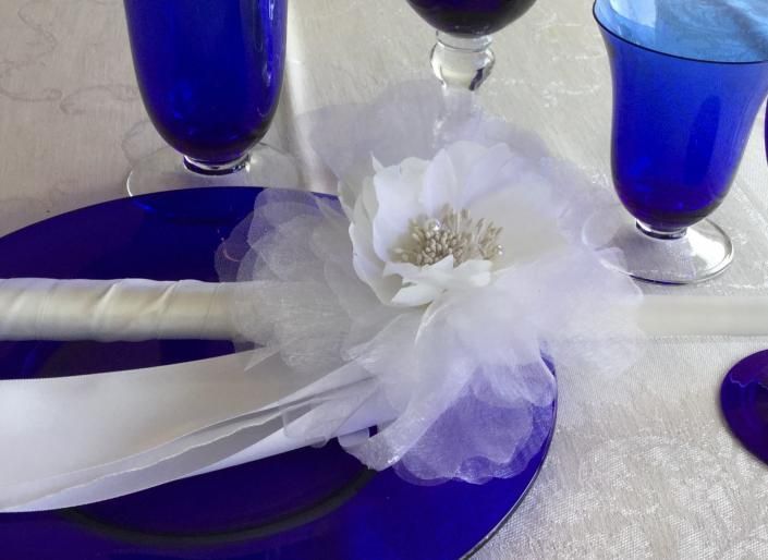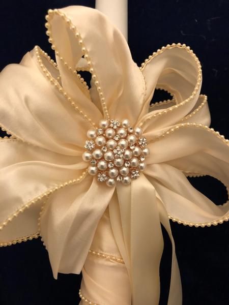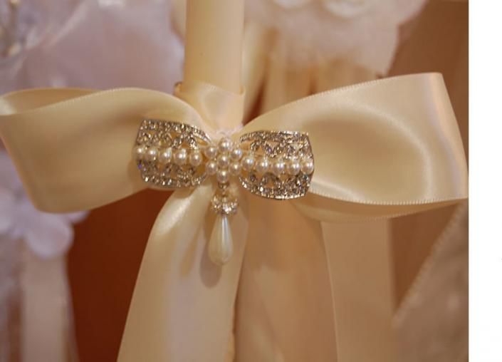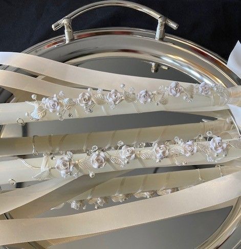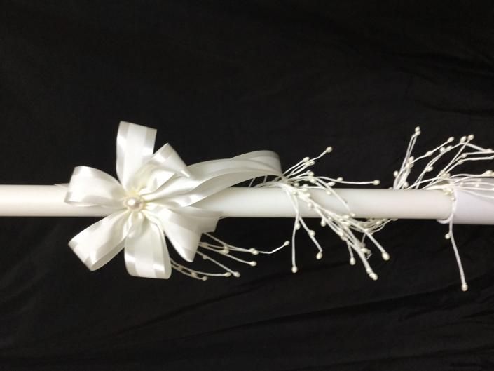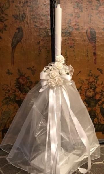 Greek Wedding Candle comes in 24 or 32 inches. The 24 inch candle is the perfect size. Adorned to match the stefana or wedding crowns and bride's dress. Let us know what you have in mind.
